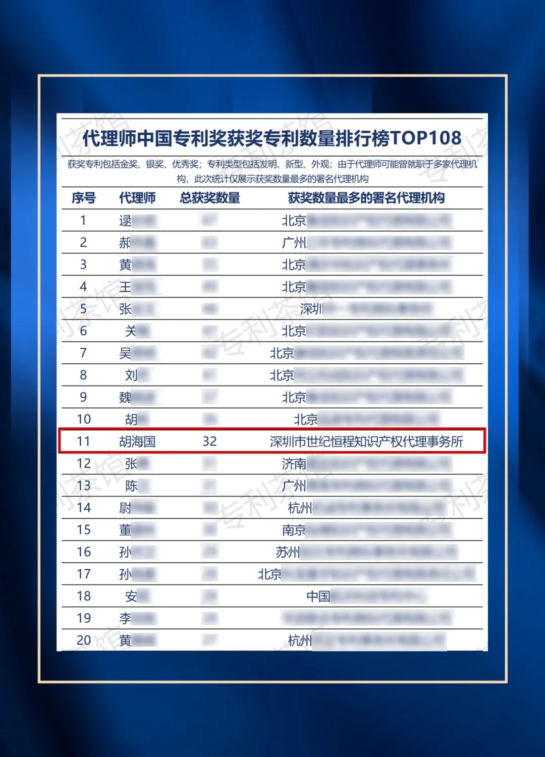 近日,“代理师中国专利奖获奖专利数量排行TOP榜单”公布(由专利茶馆整理统计),世纪恒程总经理胡海国先生位列第11位,总获奖数量32件。
