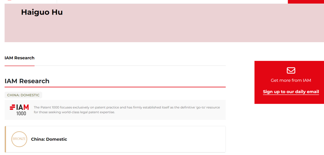 近日,国际权威知识产权媒体Intellectual Asset Management(IAM),发布了IAM PATENT 1000杰出个人推荐榜单。胡海国总裁凭借在知识产权领域的专业优势喜获荣誉。