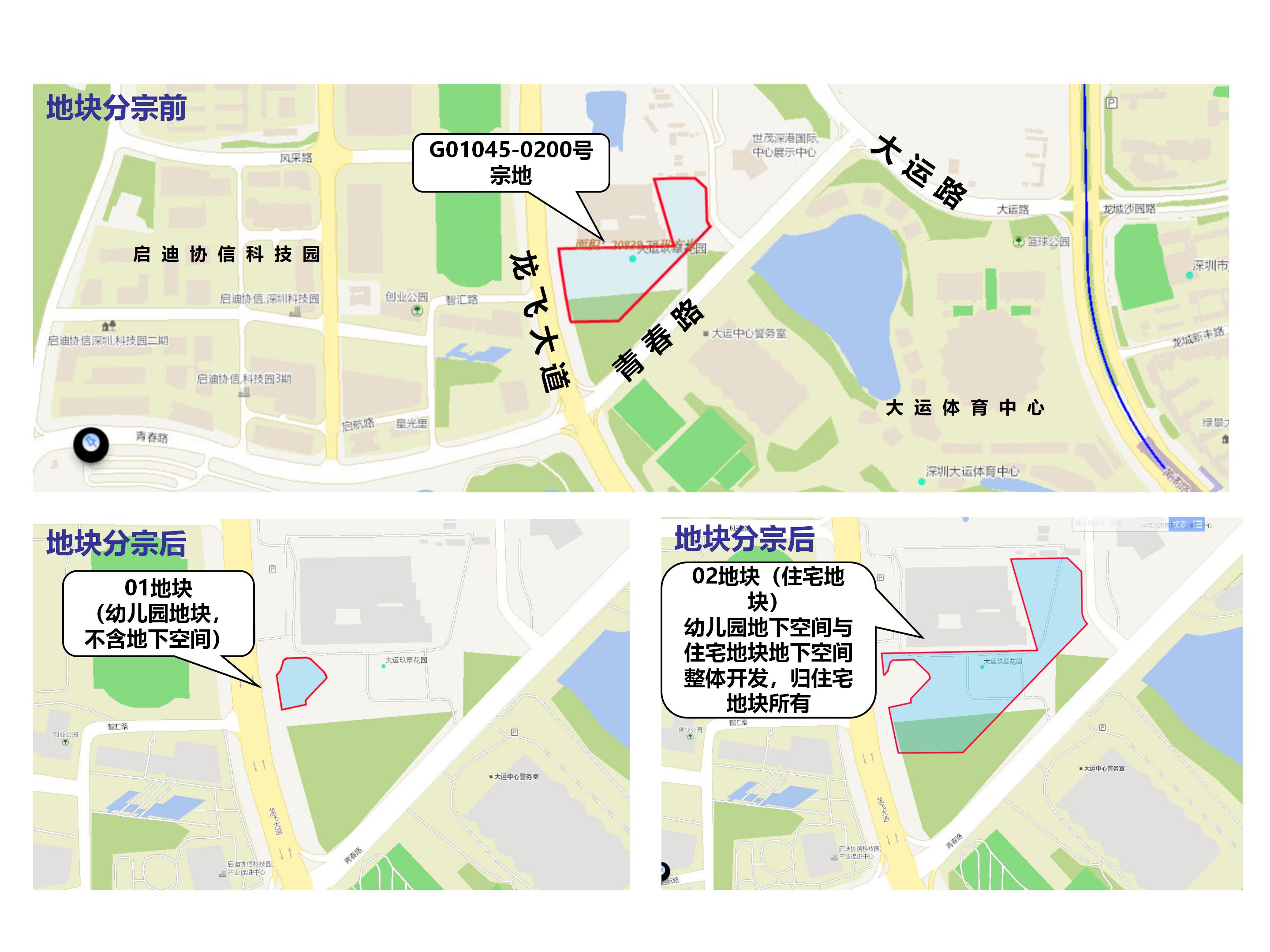 G01045-0200号宗地位于深圳市龙岗区龙城街道龙飞大道与青春路交叉口东北侧,已签订《深圳市土地使用权出让合同书》(深地合字〔2024〕2123号)及补充协议一(以下简称“《土地合同》及补充协议”),受让人为深圳市海瑞房地产开发有限公司。该宗地用地面积20838.77平方米,规定建筑面积103508平方米。根据《土地合同》及补充协议,该宗地范围内设置一所6班幼儿园(独立站地),用地面积不少于1800平方米,规定建筑面积1620平方米,产权归政府,由受让人建设,建成后无偿移交龙岗区政府,在办理商品房预售许可前进行分宗。